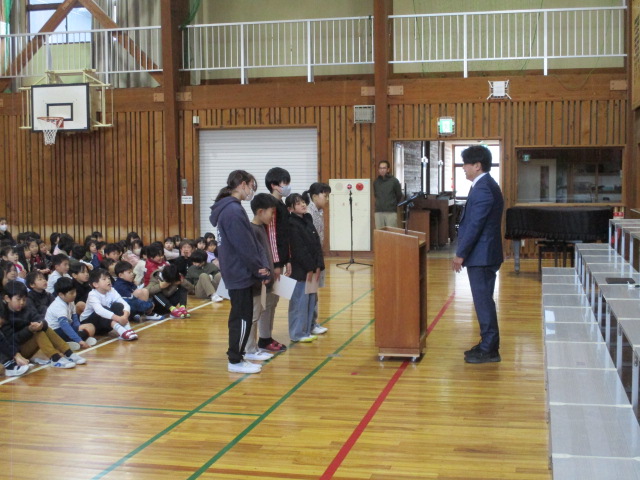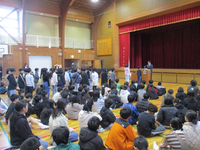 令和八年度前期児童会役員の任命式が行われ、新役員の皆さんが校長先生から一人ひとり任命書を受け取りました。これから色々な場面で学校全体を引っ張ってもらいたいと思います。任命式の後、保健委員さんよりケガの防止をテーマにしたお話があり、校内での危ない遊びについて注意喚起をしてくれました。