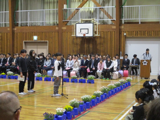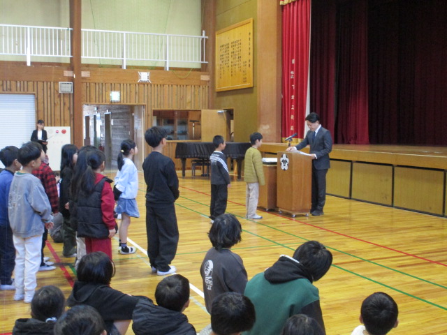 修了式が行われ、各学級の代表児童が校長先生から修了証を手渡されました。明日から春休みです。健康で安全に過ごし、新学期にみなさんが元気に登校してくるのを待っています。保護者の皆様には、本校の教育活動に対し、ご理解とご協力をいただきましたことを心より感謝申し上げます。