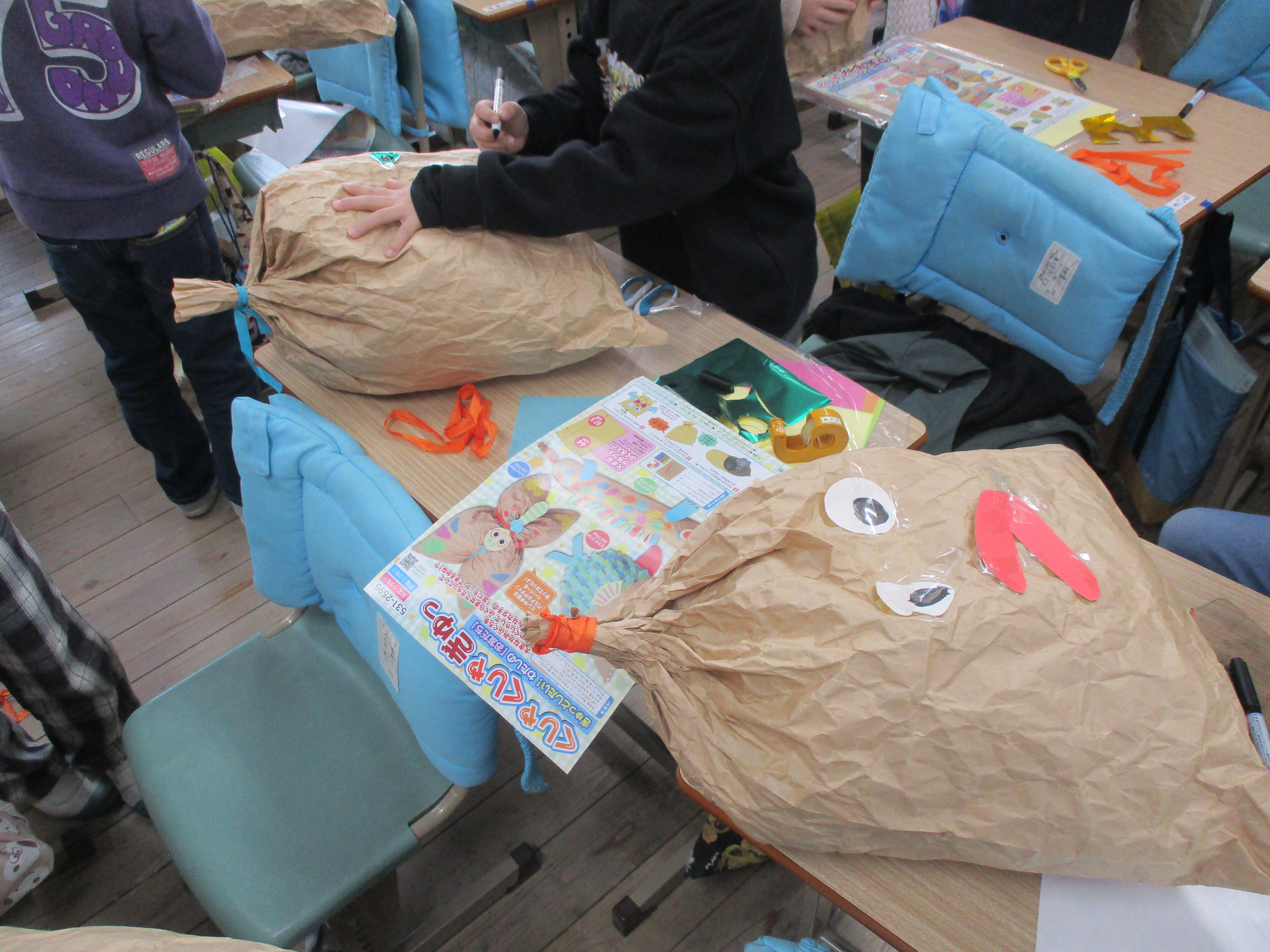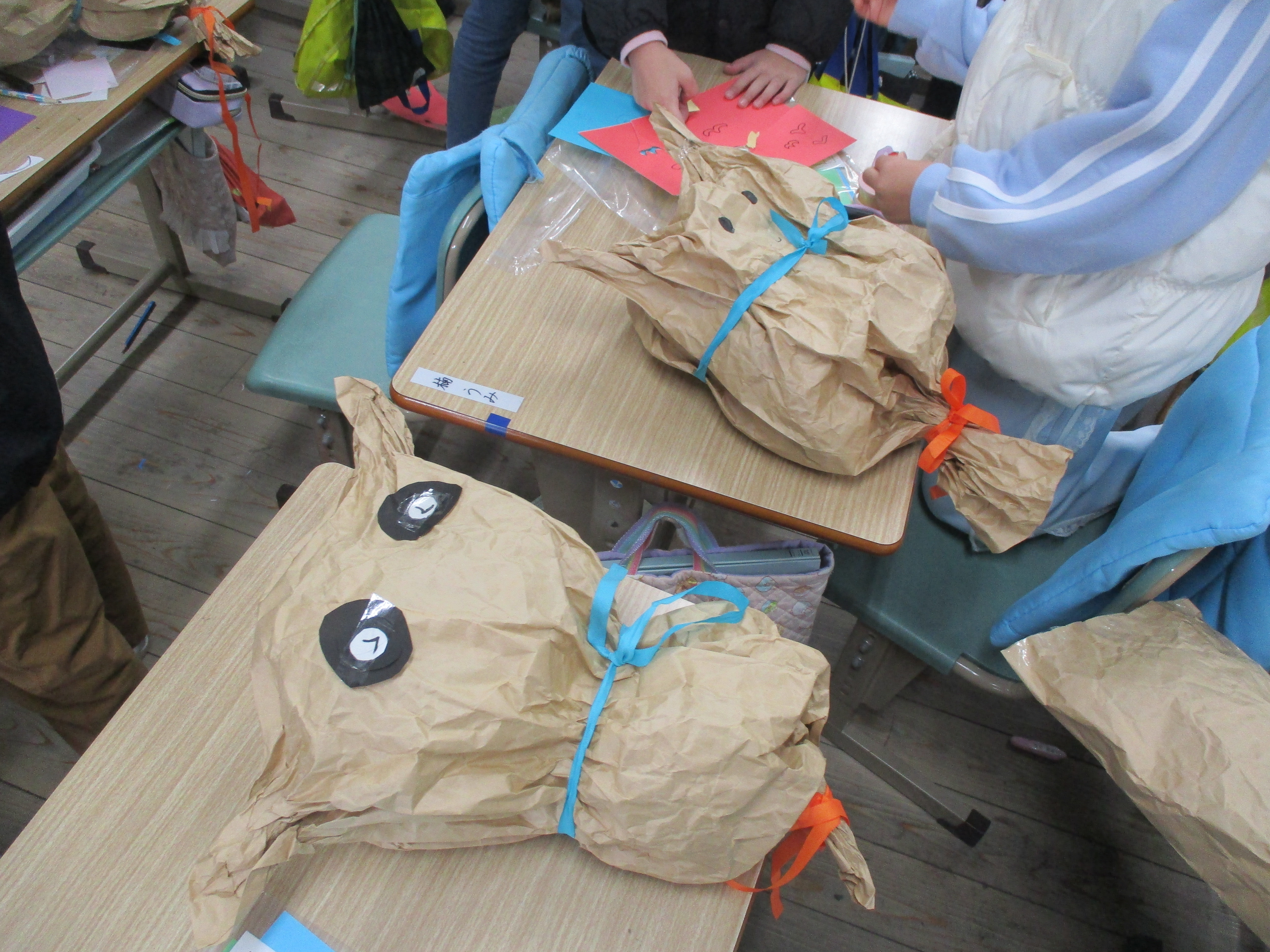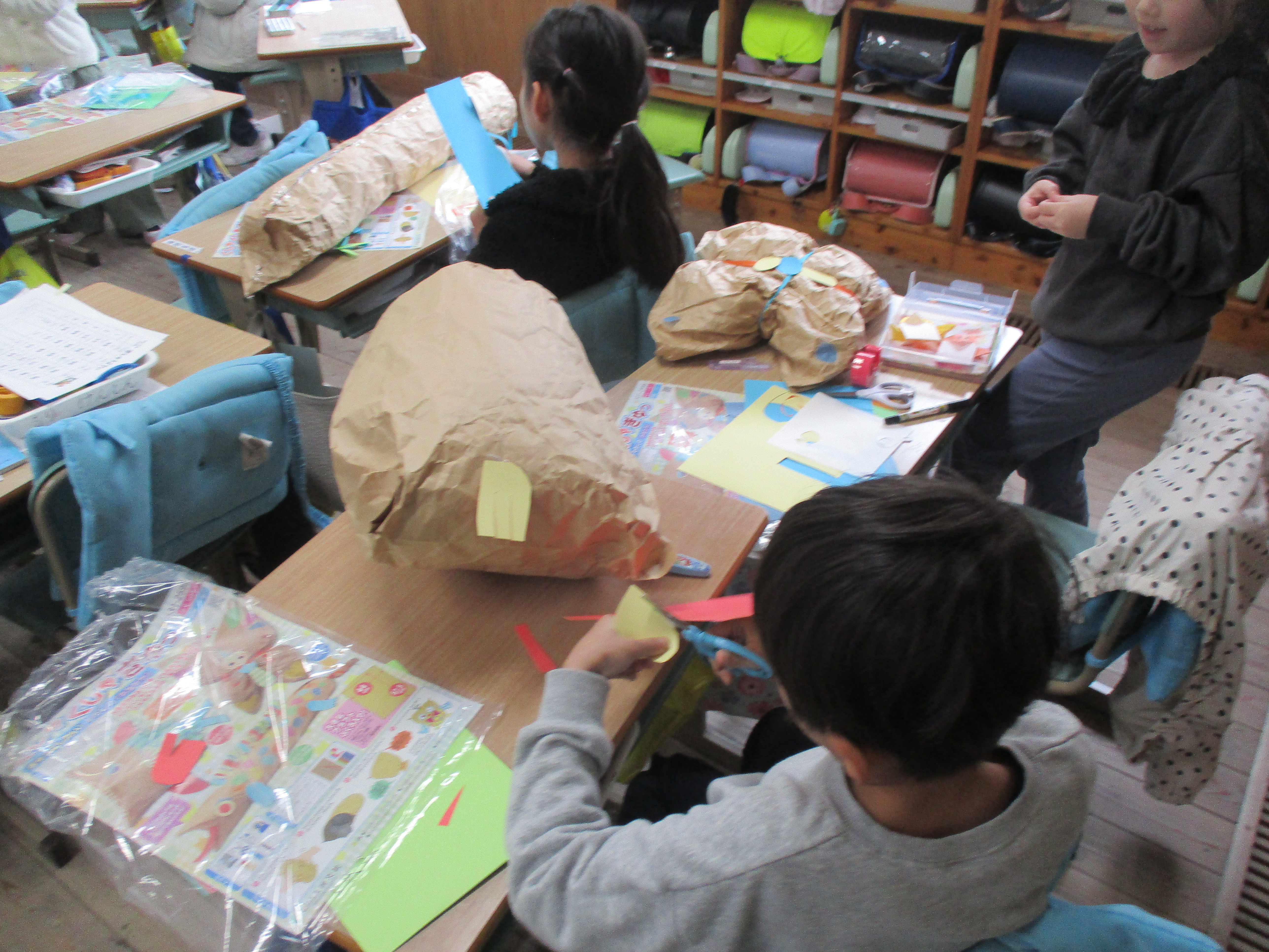 図工の学習で、「くしゃくしゃぎゅ」を作りました。くしゃくしゃにした袋に、くしゃくしゃにした新聞紙を詰めて、思い思いの生き物を作ります。子どもたちは、「くしゃくしゃにしてもいいん?」と嬉しそうに活動し、工夫を凝らしながらたくさんの面白い生き物が誕生しました!
