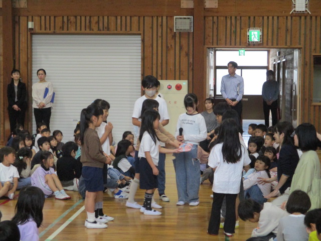 任命式の後には、「1年生を迎える会」がありました。校歌、歓迎の言葉と続き、最後に2年生から花の種のプレゼントが贈られました。短い時間でしたが、1年生との交流の場となりました。