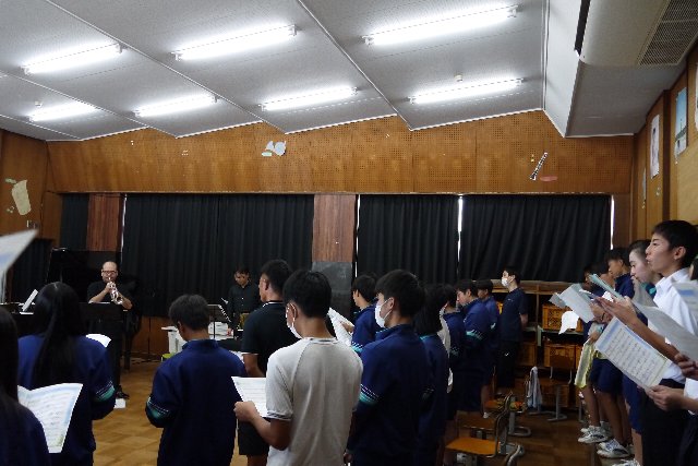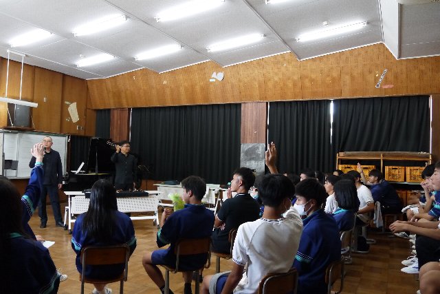 3年生は音楽室で、間近での楽器紹介や演奏を体験。パーカッションを使った「楽器当てクイズ」、最後には本番で合唱する「旅立ちの日に」を、生演奏の伴奏とともに歌いました。1・2年生は各教室からオンラインで参加し、同じ時間を楽しみました。