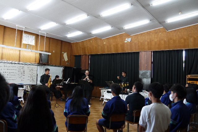 先日、9月12日(金)には、シエナから奏者4名(サクソフォン・トランペット・パーカッション・ピアノ)と事務局の方2名をお迎えし、事前ワークショップを行いました。