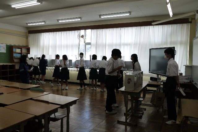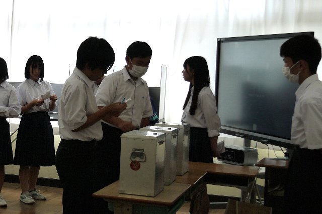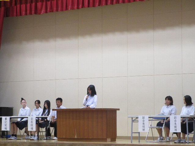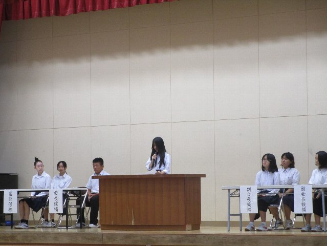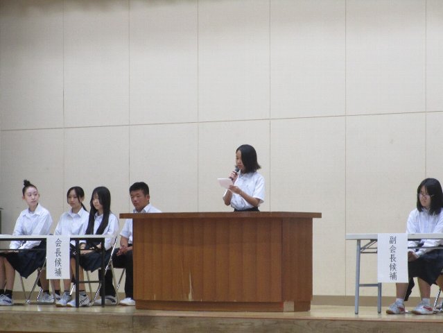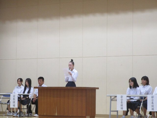 9月25日(木)に令和7年度後期生徒会選挙の立会演説会と投票が行われました。選挙管理委員会委員の竹内さんと田原君の進行のもと、各役員の立候補者とその応援演説者が体育館の舞台から生徒の皆さんに公約を伝えました。今回の選挙は役員の定数(会長1名、副会長2名、書記1名)と立候補者の数が同じであったため、信任・不信任投票となりました。即日開票し、結果発表を9月26日(金)の放送集会で行いました。投票の結果は以下の通りです。