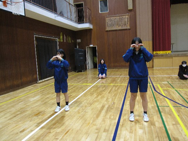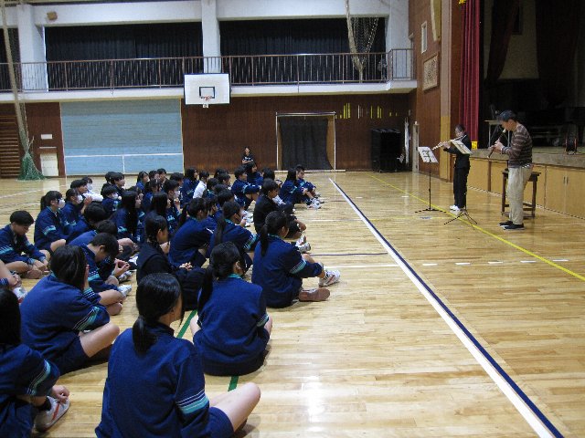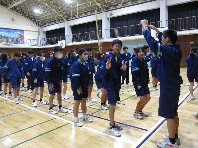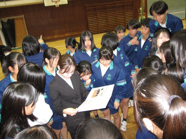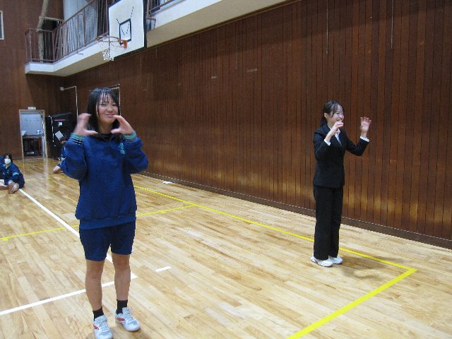 集会では、ジェスチャー伝言ゲームで大いに盛り上がった後、元音楽部の小林先生と、当時から顧問を務めている田伏先生が一緒に「正解」を演奏してくださいました。最後には小林先生からお話をいただき、2年生が感謝の気持ちを込めて準備したメッセージをお渡ししました。