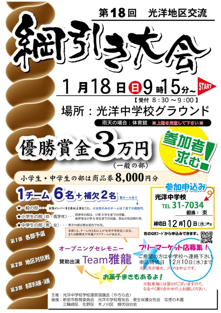 綱引き大会チーム募集中です。お知らせ2025.12.02今年も、やろら会(光洋中学校学校運営協議会)主催の綱引き大会を開催します。出場チームを募集しています。下に申込みフォームのリンクを貼っておきます。たくさんの申込みをお待ちしています。申込みはこちらから → https://forms.gle/rcR79foMoof5ZZsi6