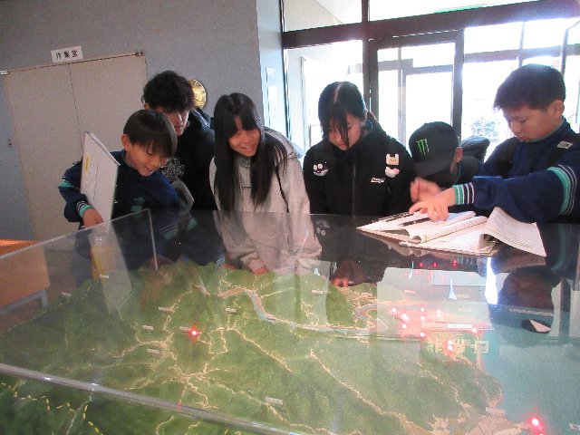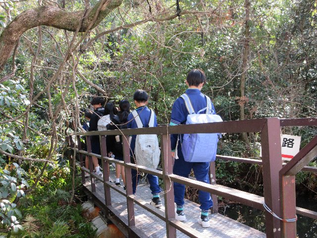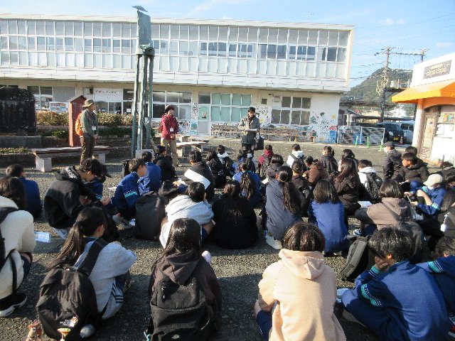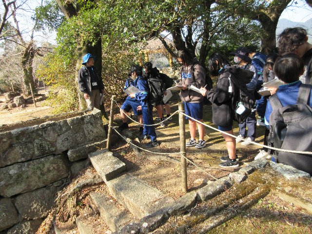 1月16日(金)、1年生が市内探訪に出かけました。総合的な学習の時間の「ふるさと学習」の一環として、身近な地域についての理解を深めることなどを目的として実施しています。今年は、新宮駅でボランティアガイドさんと合流したあと、4つの班に分かれて「阿須賀神社・歴史民俗資料館・新宮城跡・浮島の森」で現地学習を行いました。