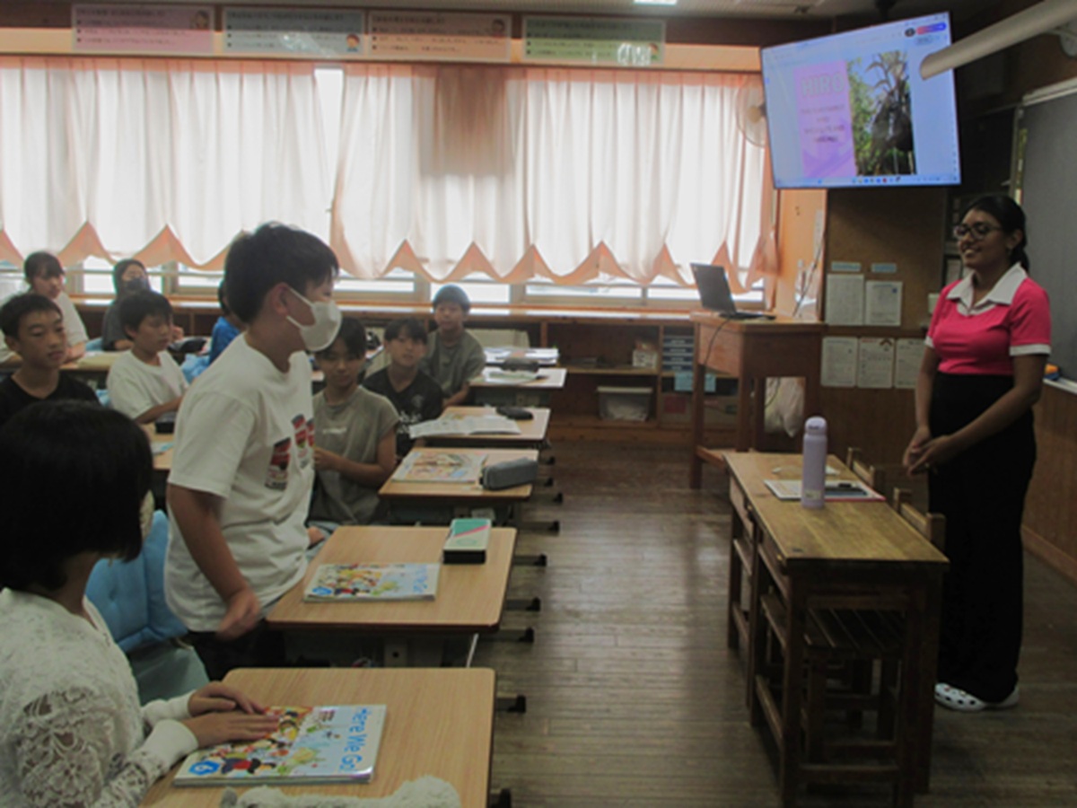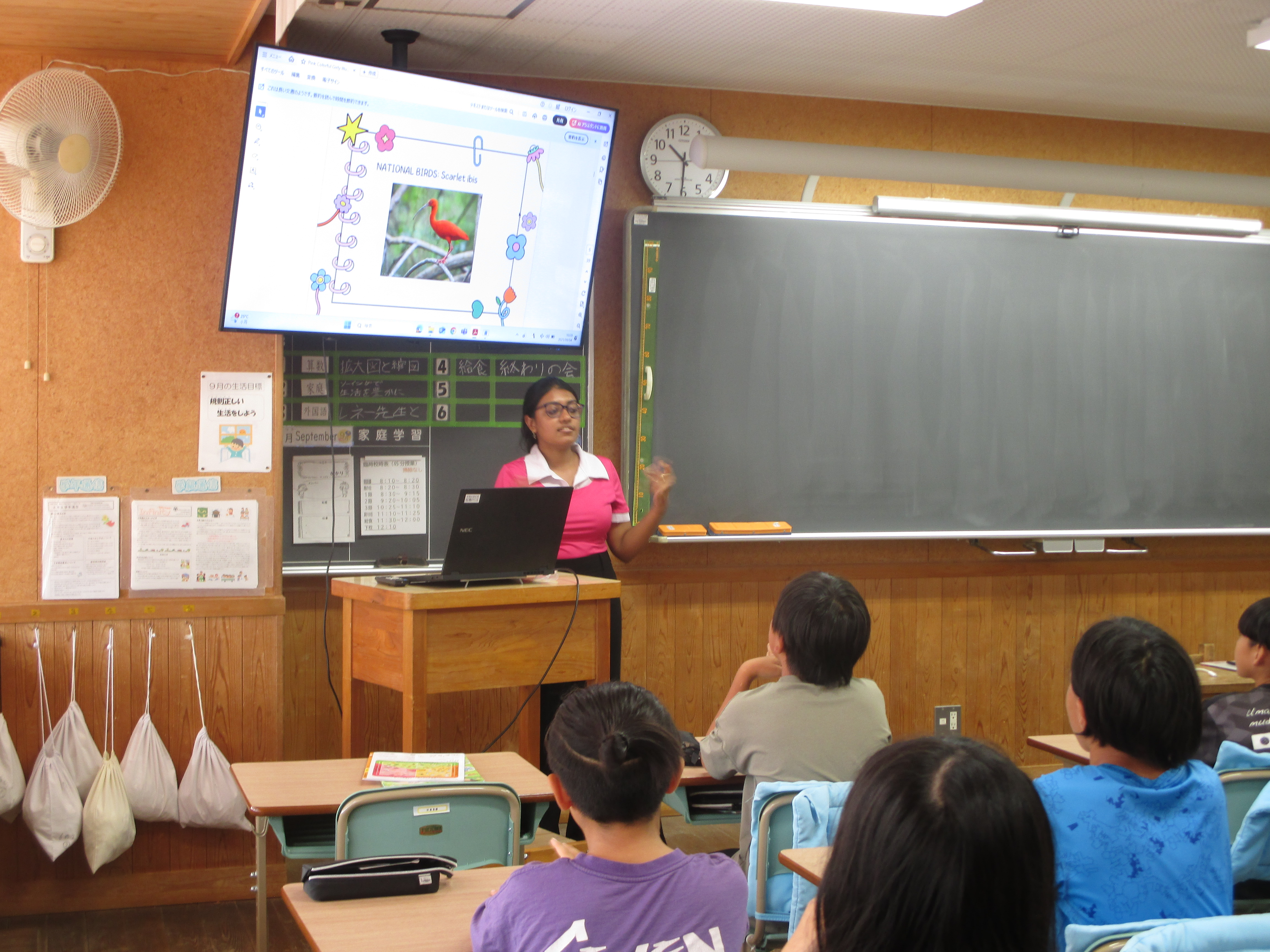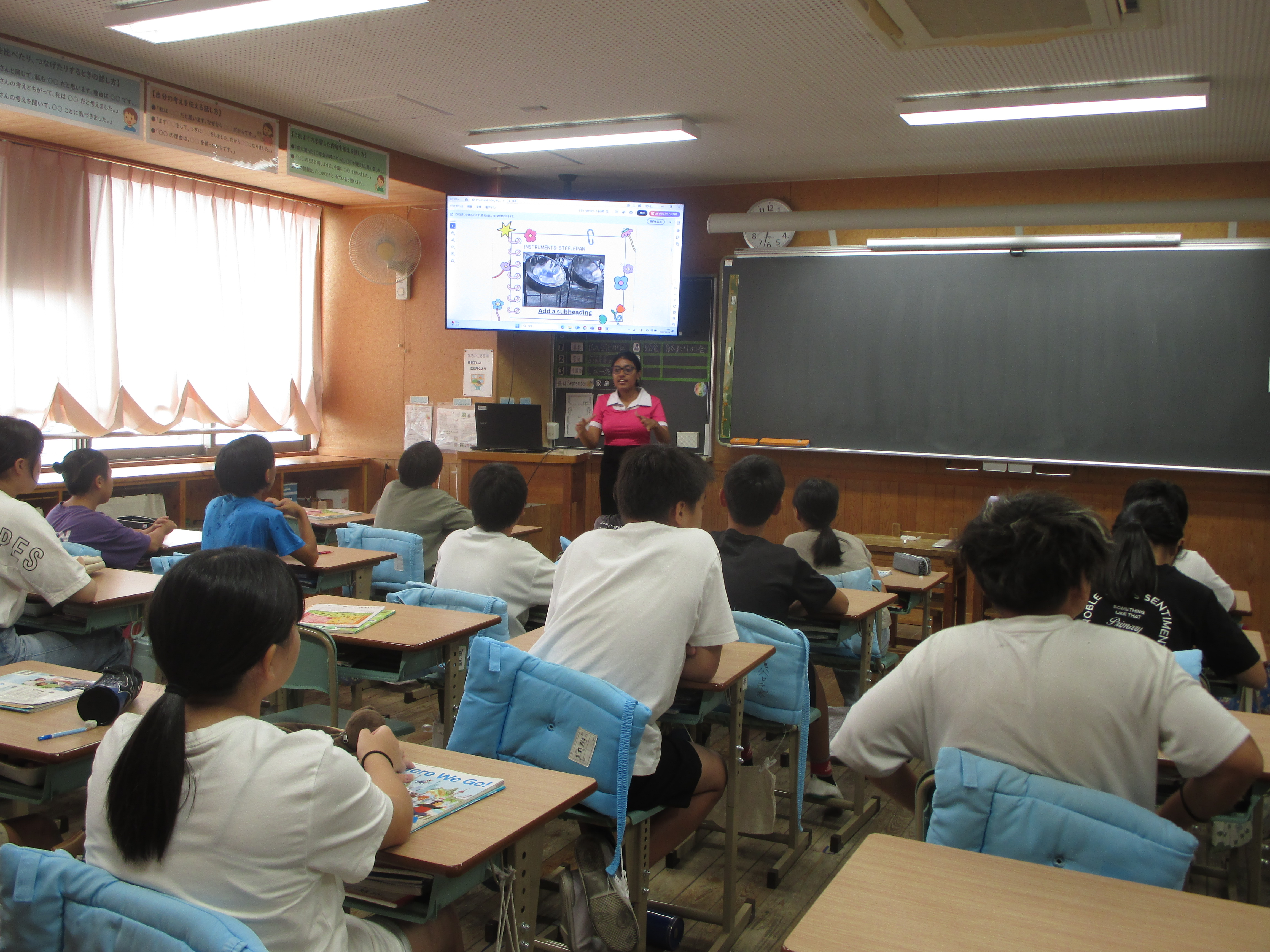 2学期から新しいALTとして来てくれたレネー先生との初めての外国語学習がありました。まずはレネー先生の自己紹介です。スライドや動画を使って先生が生まれ育った国の特色や文化、好きな食べ物などを紹介してくれて楽しみながら先生のことを知ることができました。