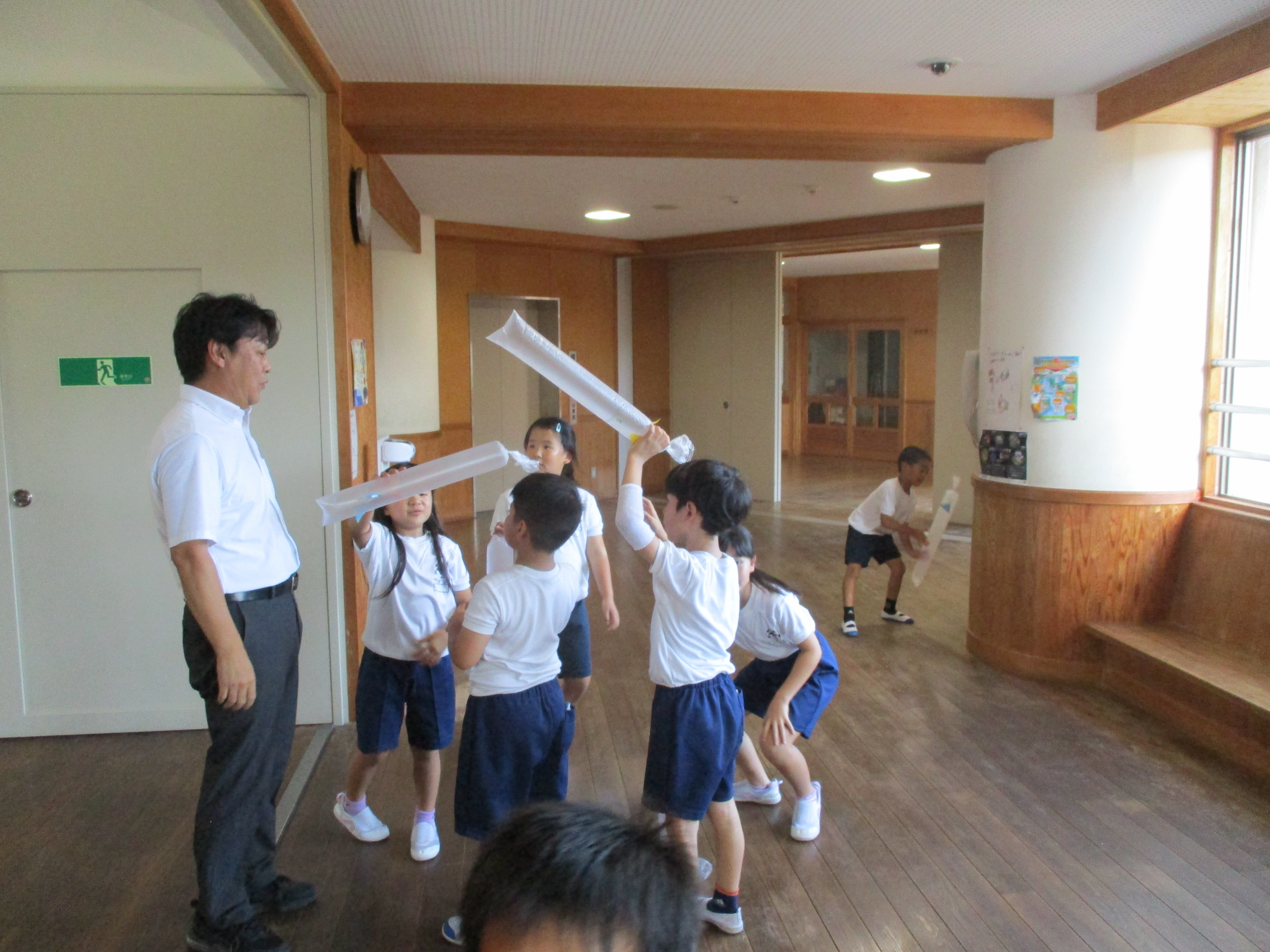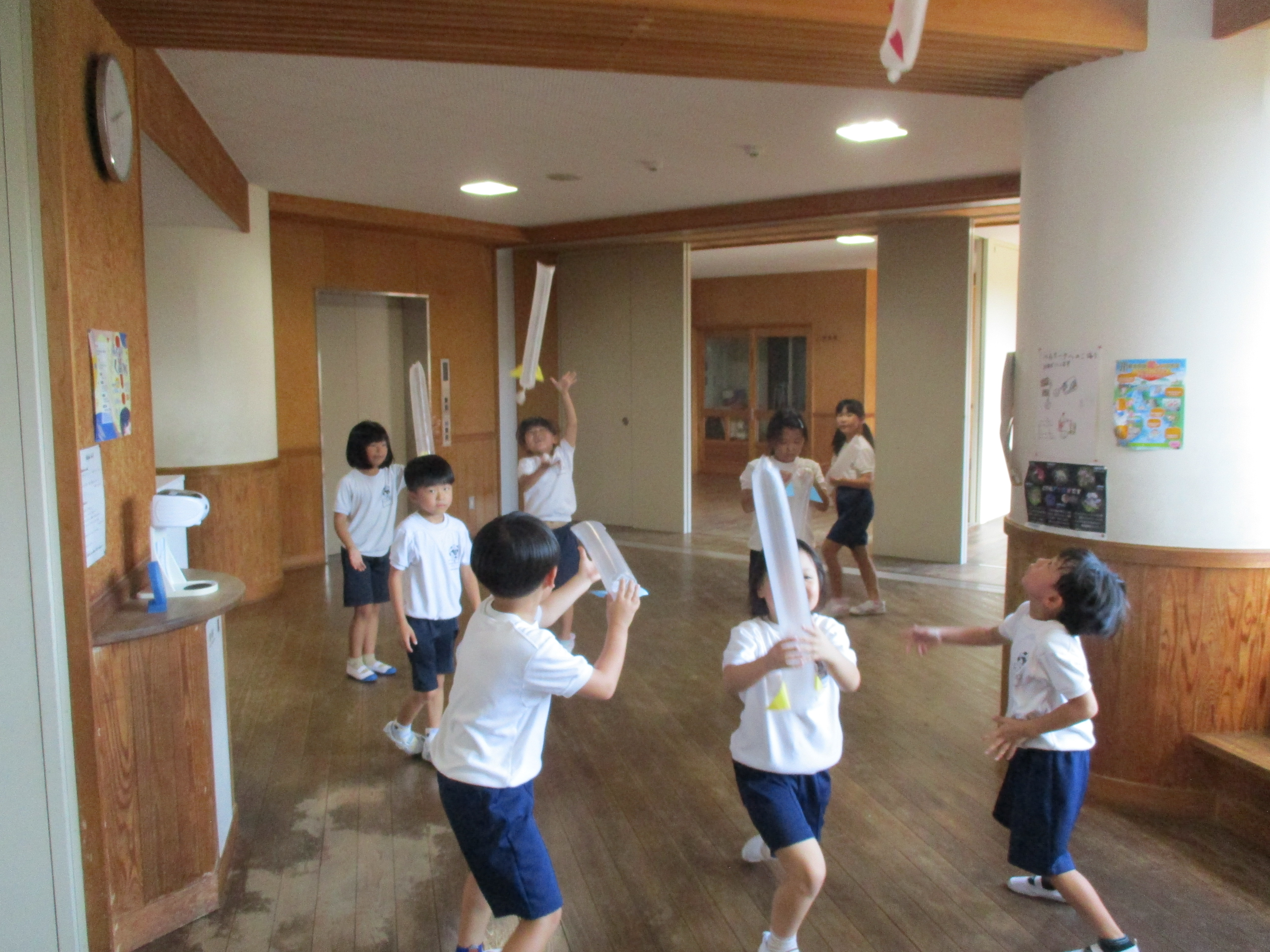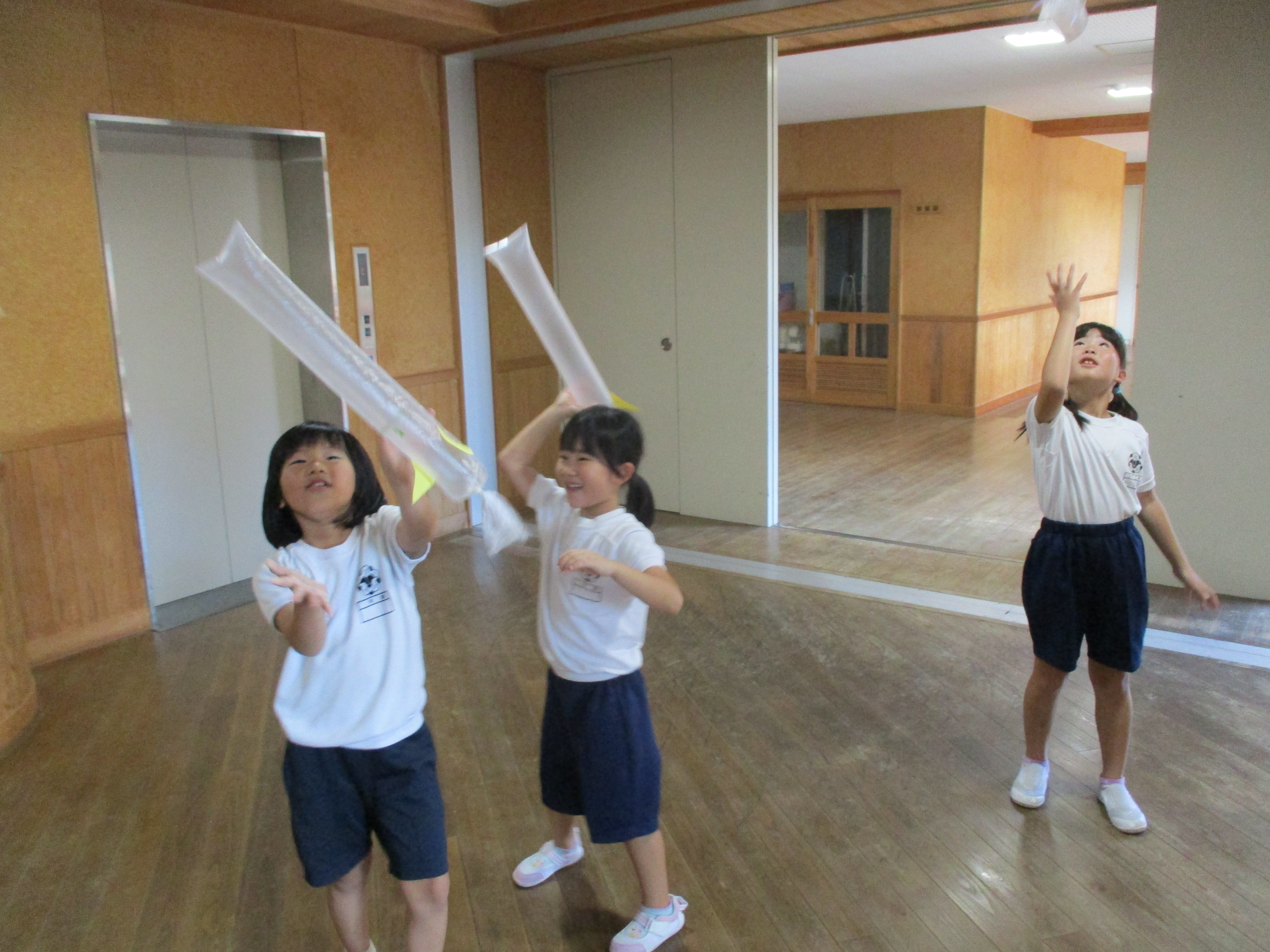 第一回目は、『傘袋ロケット』です。「空気をぬけにくくするためには・・・」「もっと遠くに飛ばすには・・・」など、みんなそれぞれ考えながら工夫して作ったり遊んだりしました。