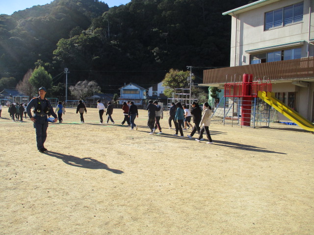 今日は火災避難訓練を実施しました。2階の理科室から火が起こった想定で、全校児童が運動場へ避難しました。口と鼻をハンカチや衣服でおさえ、速やかに避難することができました。避難後には新宮消防の方からの講評があり、避難時に大切なことについてお話を聞きました。