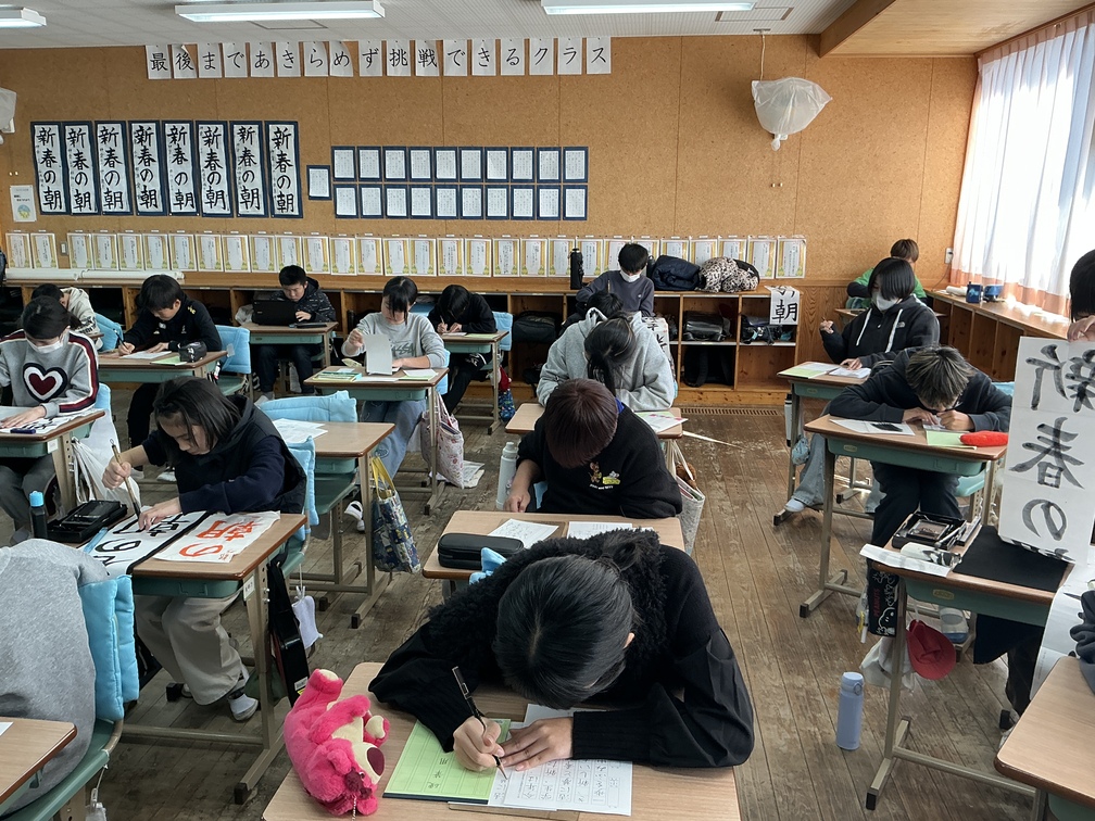 1枚書き終えると「息止めていたから疲れた」という声や、大きく息を吐く音が聞こえてきました。それだけ集中して書いた証だと思います。これまでの練習の成果を出し切り、自分史上最高の字を書けるようにしていきましょう。