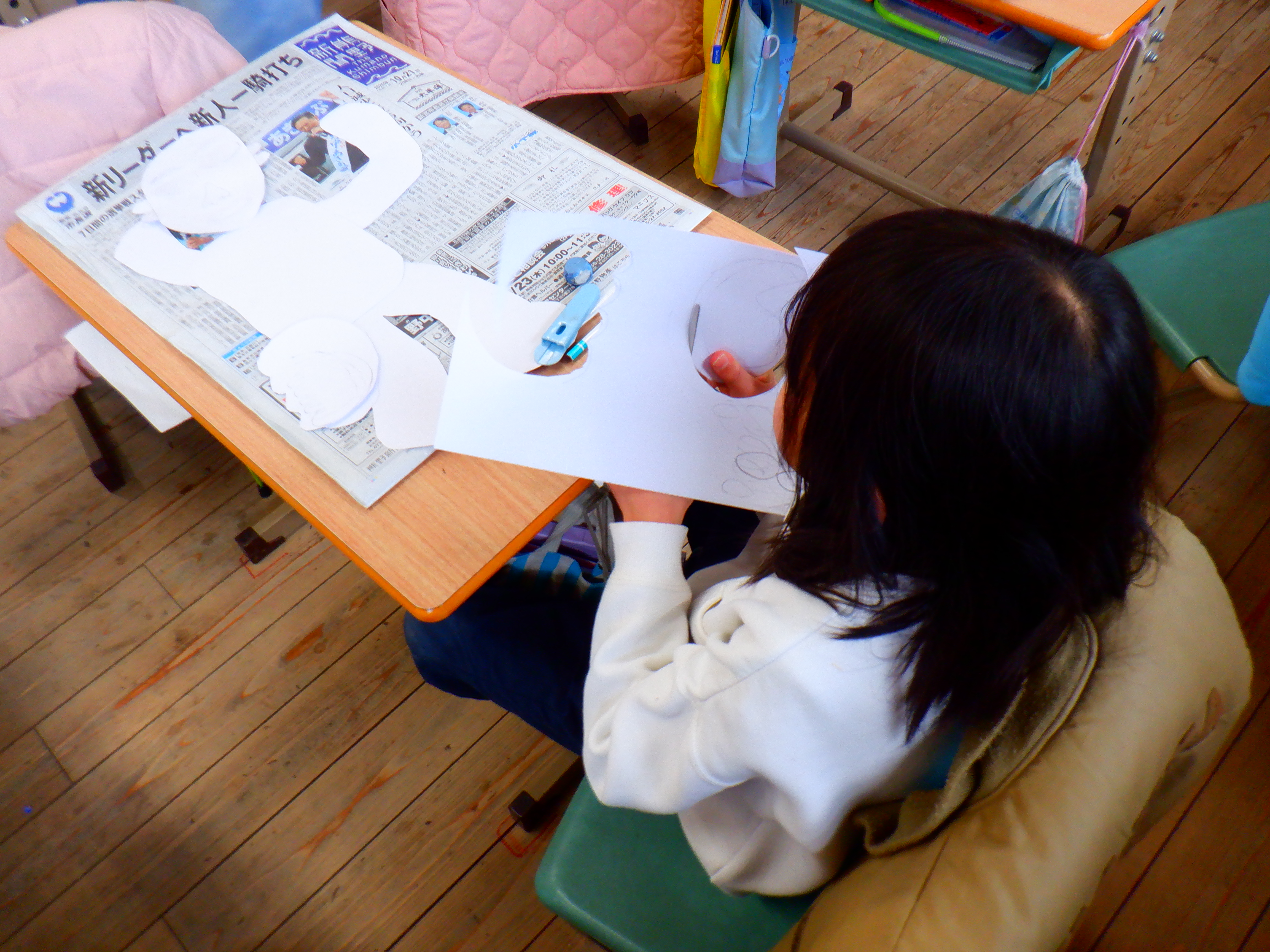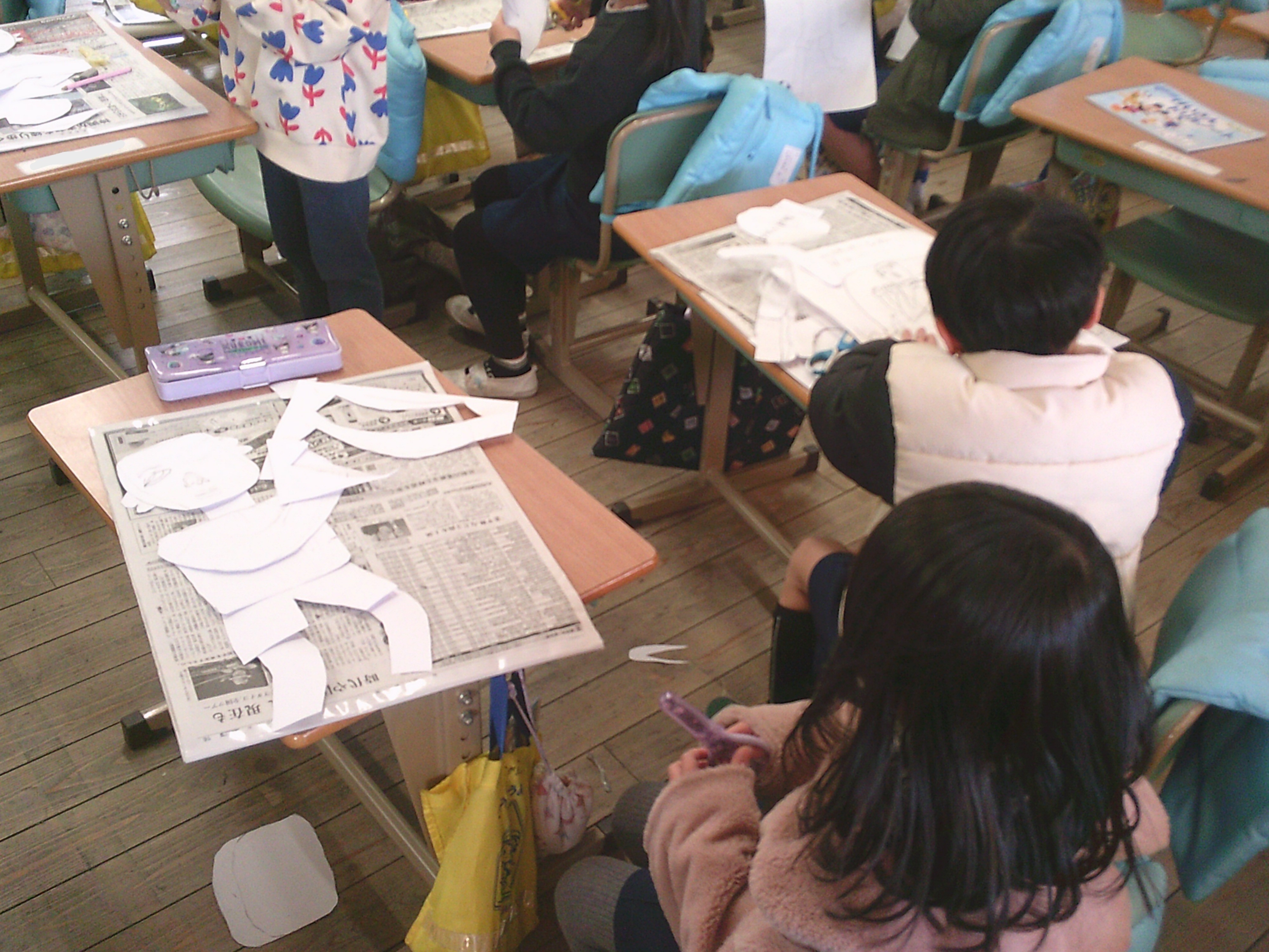 図工の学習で紙版画をしています。縄跳びや鉄棒、サッカーなど、どんな動きを版画で表したいか一人一人考え、制作を始めました。友達に自分のイメージしている動きをしてもらったり、絵で描いたりして腕の曲がり方や手の形を捉えていきます。バランスを考えながら、体のパーツを一つ一つ書き、切るのは難しく大変な作業ですが、試行錯誤して取り組んでいます。個性豊かな作品が仕上がるのを楽しみにしています。