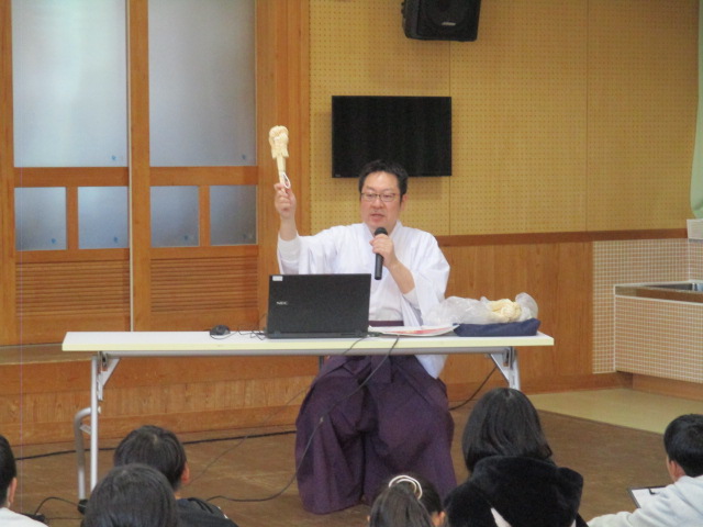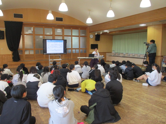 6年生のふるさと学習があり、講師として熊野速玉大社禰宜のM中さんをお迎えしてお燈祭りの講話をしていただきました。例年、2月6日のお燈祭前にM中さんからお話しをしていただき、祭りについてより深く学ぶ機会としています。6年生はお燈祭りの歴史や地元の文化など様々なお話を聞き、祭りが受け継がれてきた理由や長い歴史を感じる学習となりました。