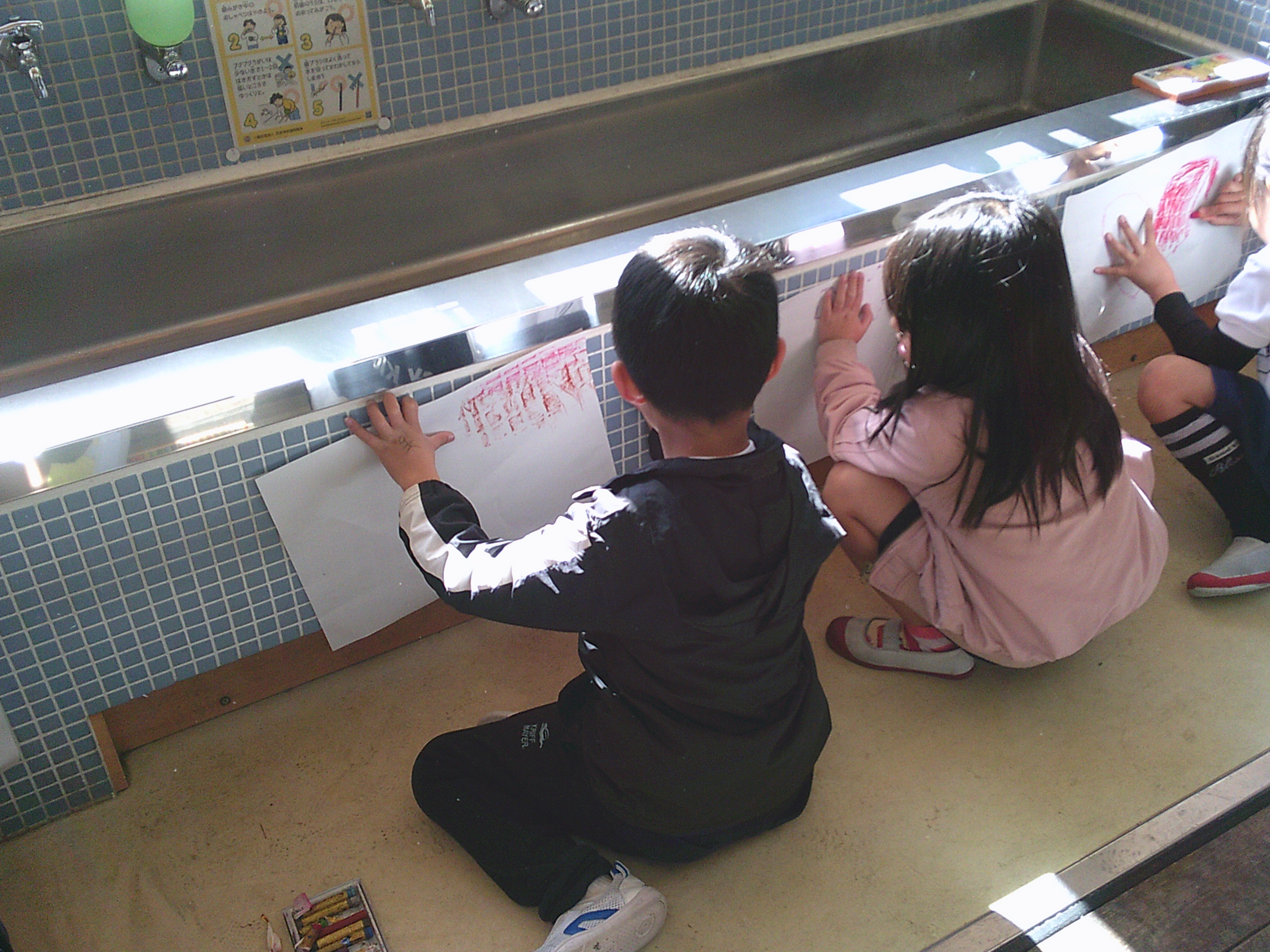 図工で、「こすりだしからうまれたよ」の学習をしました。木の壁や手洗い場のタイルなど、でこぼこのある場所に紙をあて、クレパスで色を塗っていきます。色を塗ると模様がでてくる様子に子どもたちは感動し、「すごい!」「あの壁でもやってみたい!」と楽しそうに取り組んでいました。模様を生かして恐竜や魚などの生き物を描いたり、メロンやみかんなどの食べ物を描いたりと個性豊かな作品が仕上がりました。