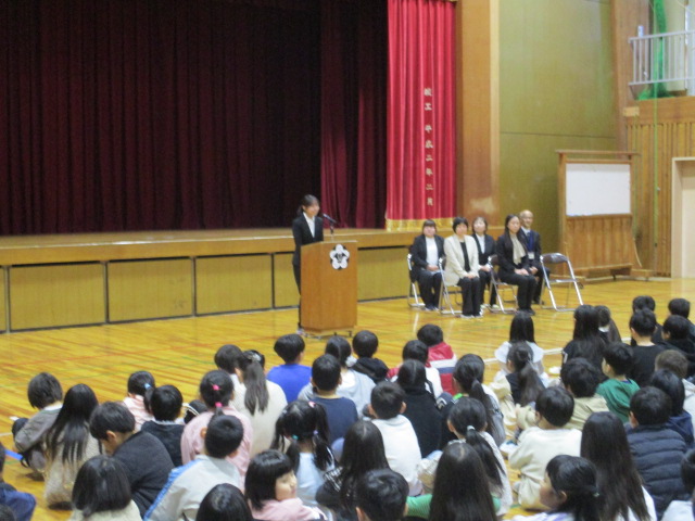 神倉小を転任・退職される先生方の離任式を行いました。はじめに、校長先生からの紹介があり、その後、先生方からお別れの挨拶がありました。新しい環境でのご活躍を祈っています。