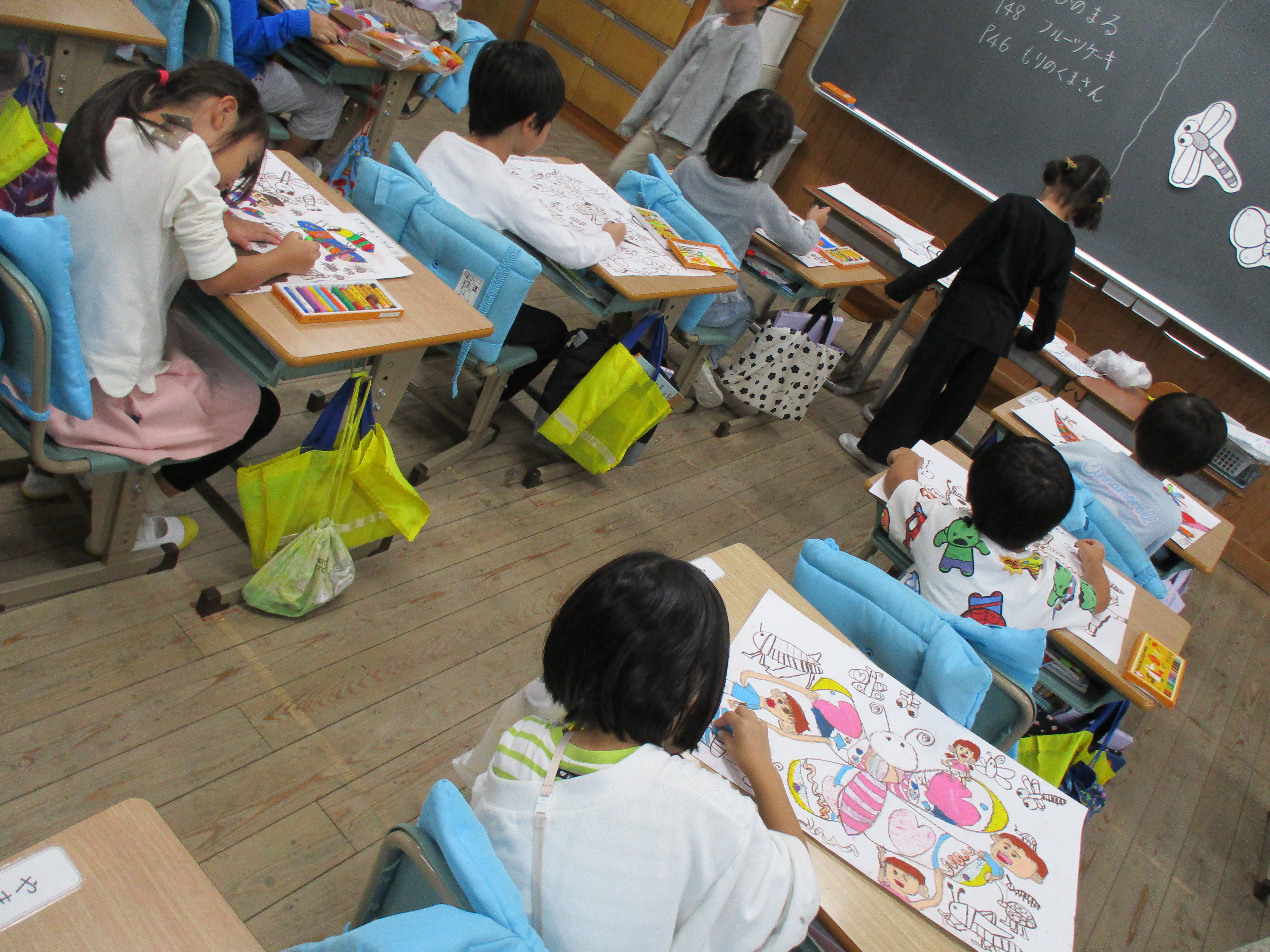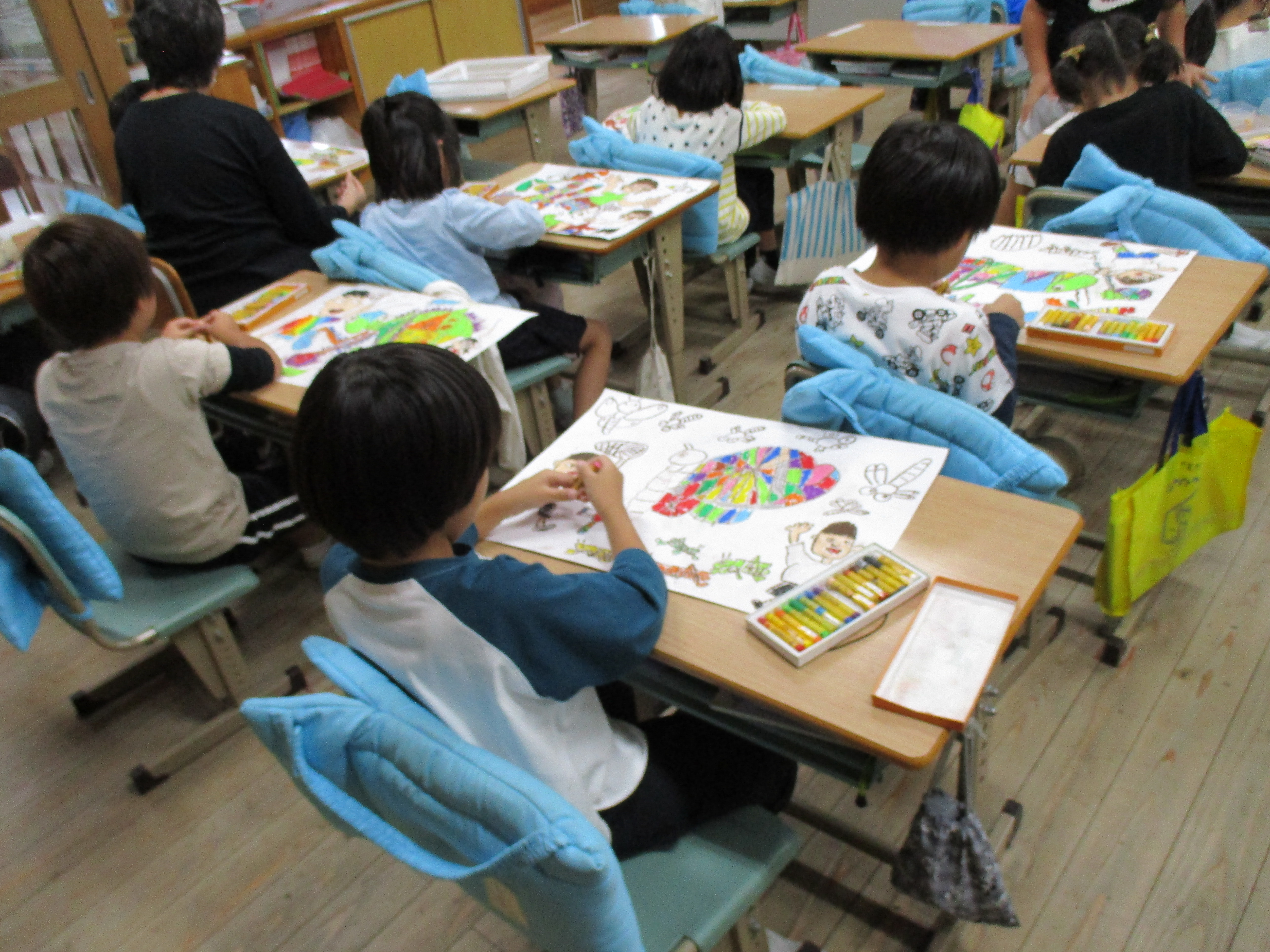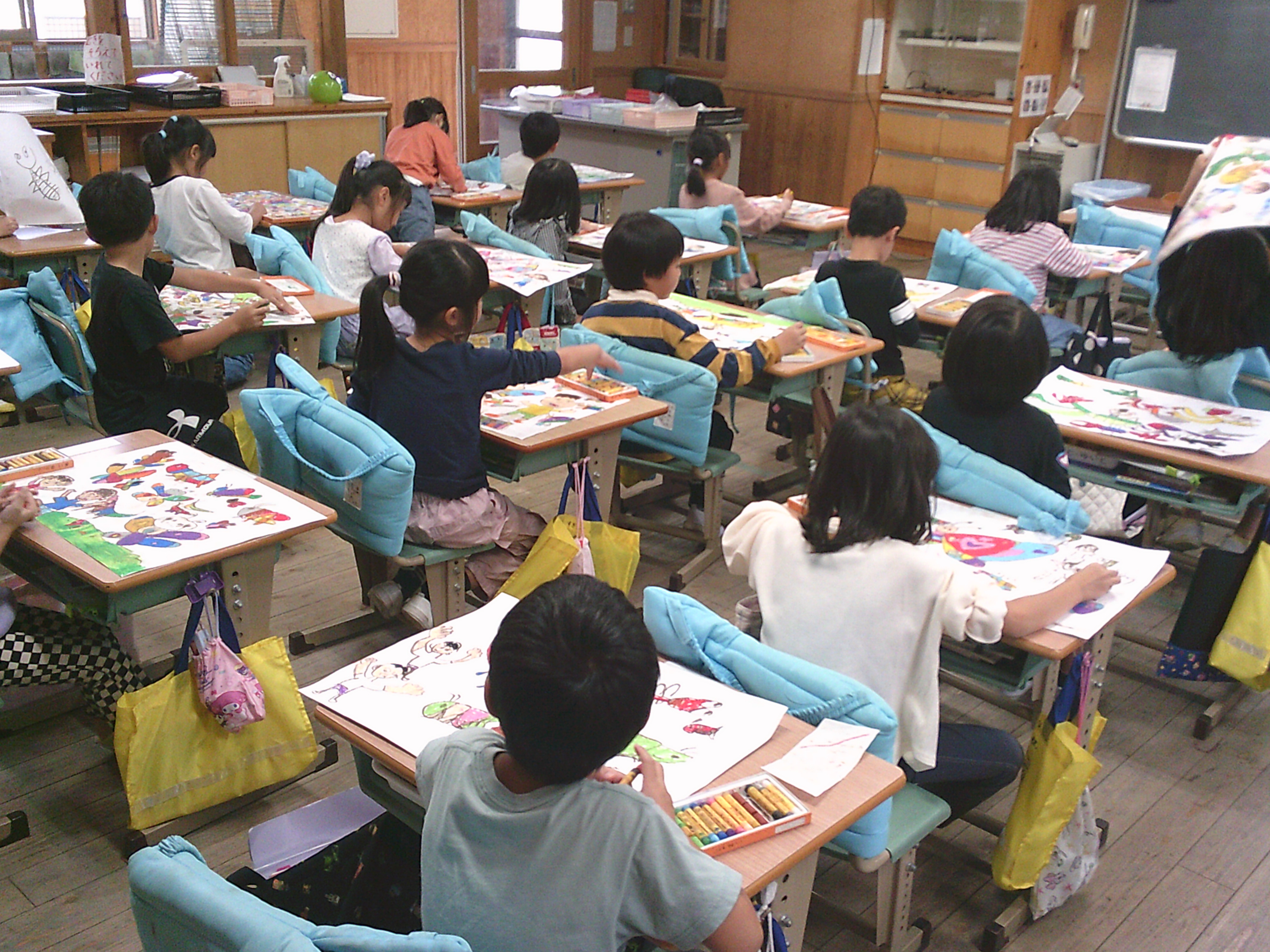 図工では、運動場で虫取りをして楽しんだことを思い出しながら絵を描きました。チョウチョの羽に捕まったり、バッタの背中に乗っていたり…「虫たちとこんな感じで遊びたい!」と想像しながら、思い思いに描いていました。お気に入りの虫をおしゃれな色にしてカラフルな虫の世界になっています。どの子の絵も楽しそうな声が聞こえてきそうで、完成が楽しみです。