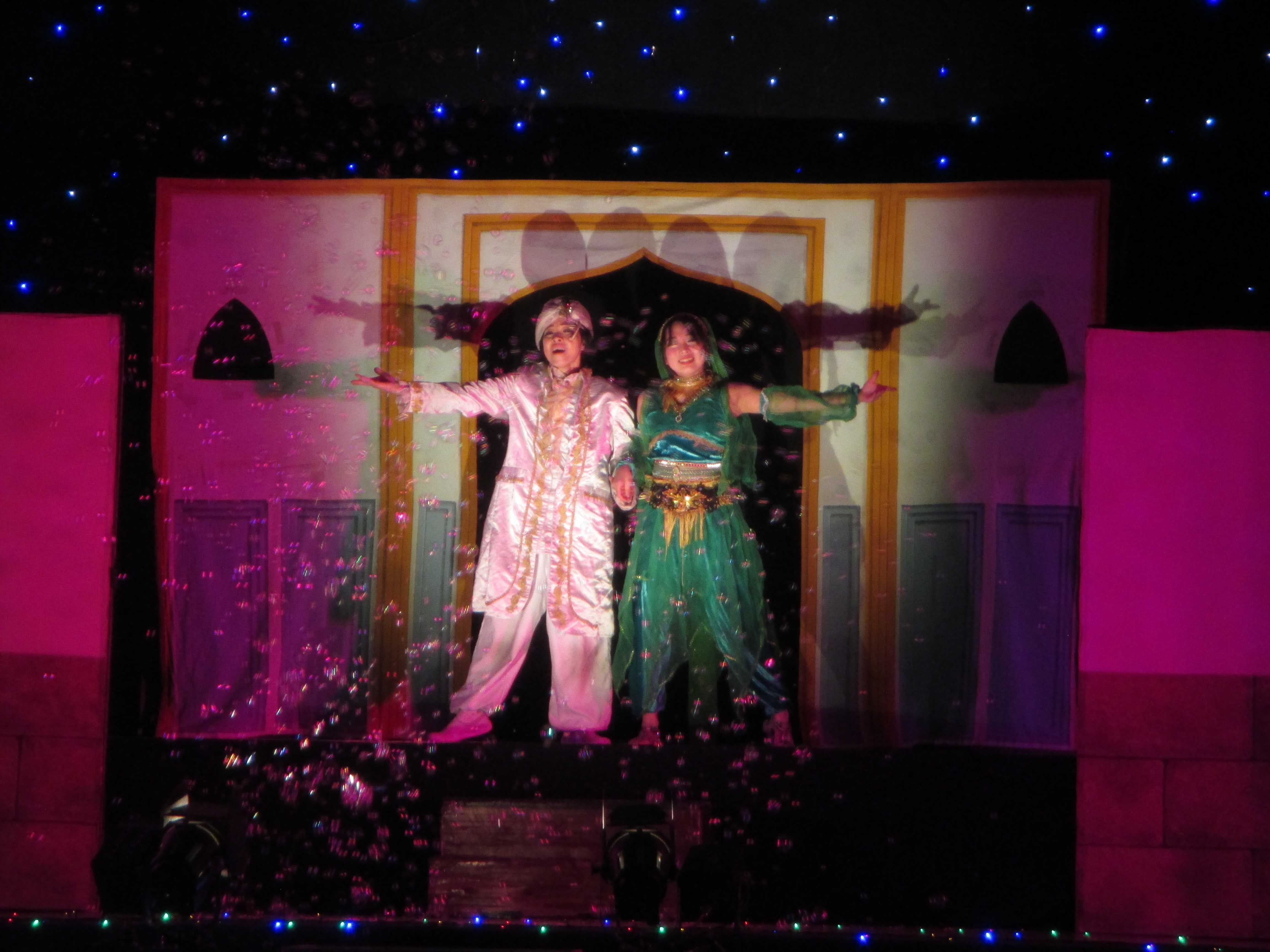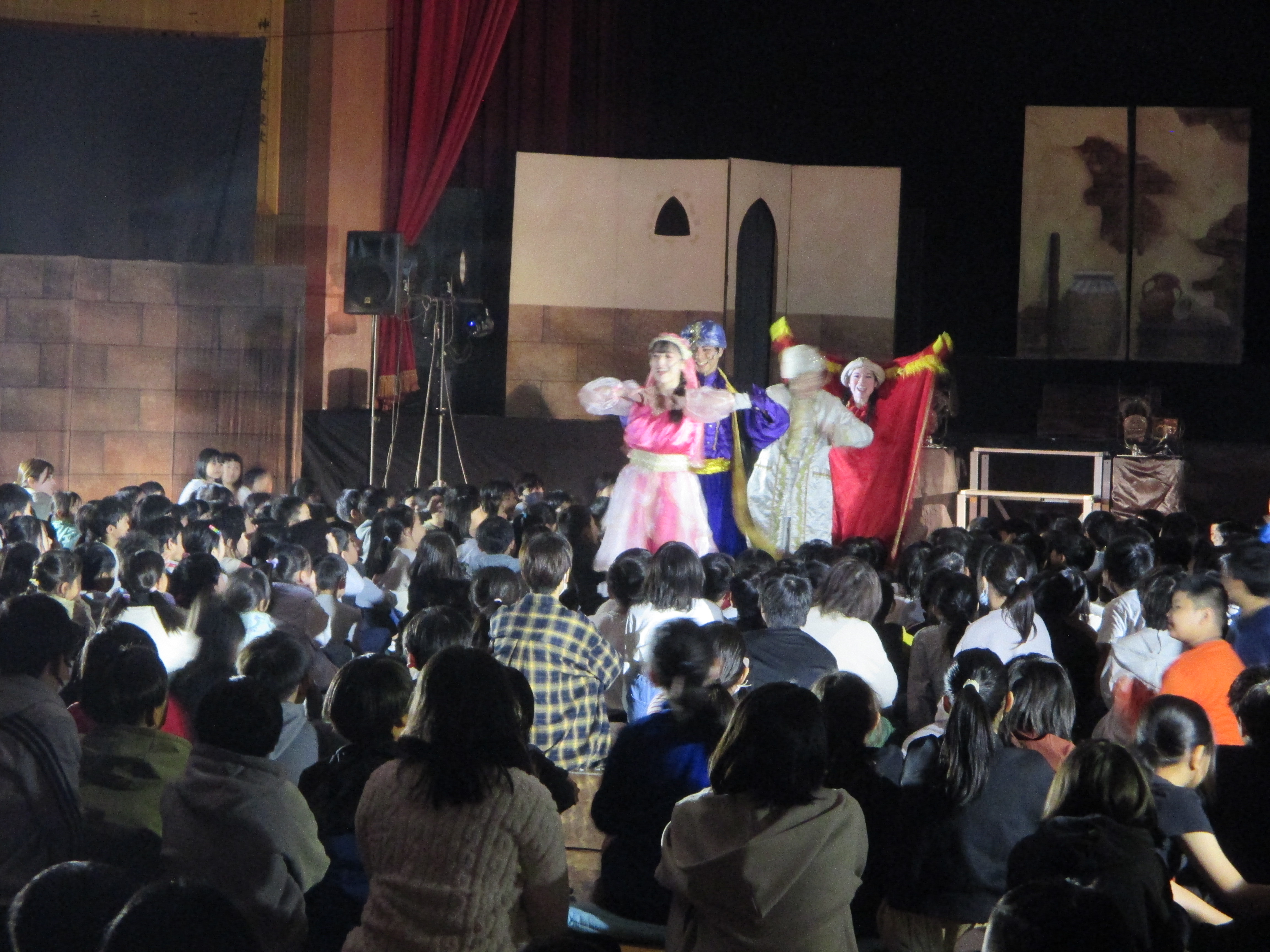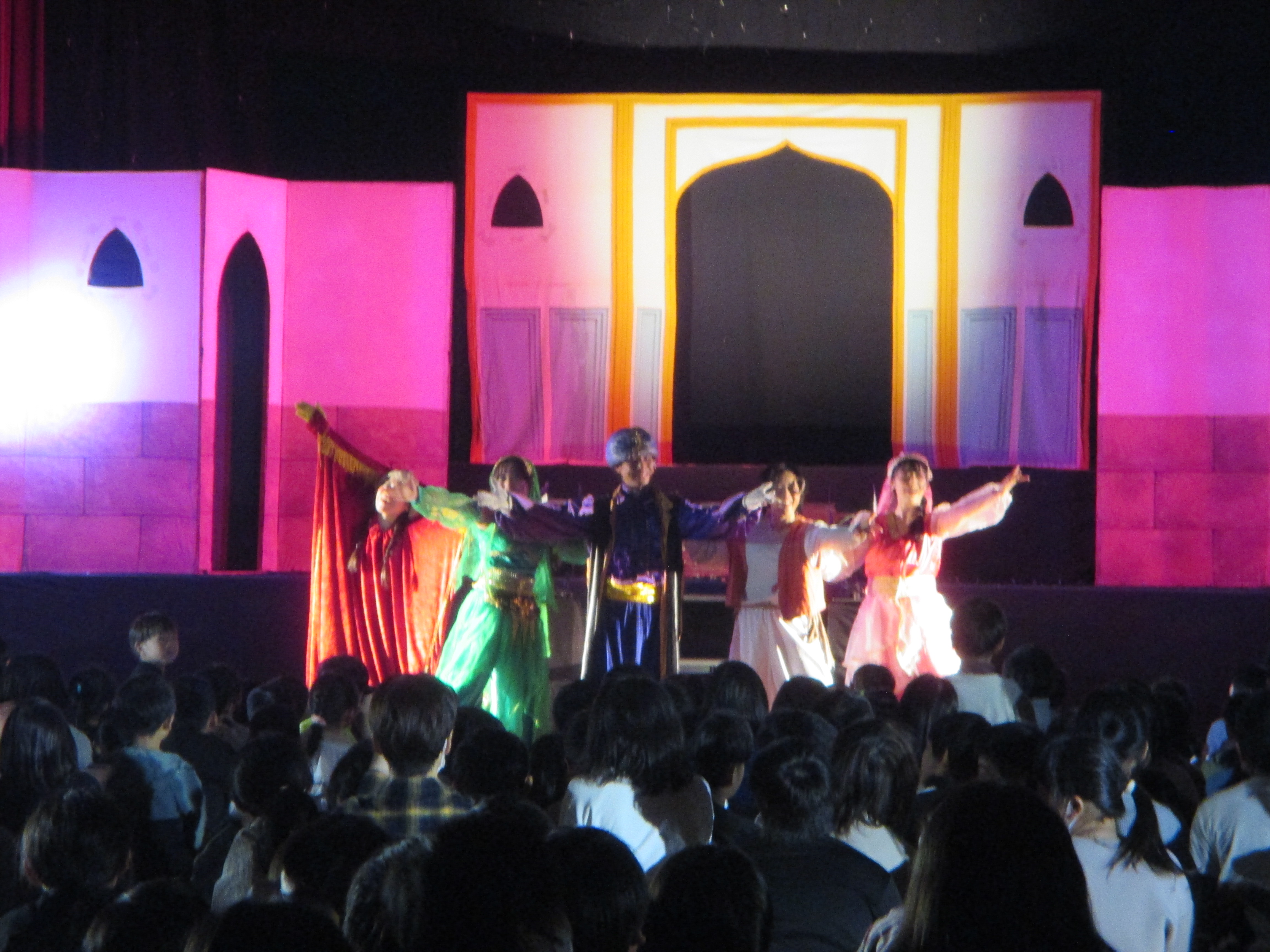 劇団歌舞人の皆さんによる演劇『アラジンと魔法のランプ』が上演され、子どもたちは普段触れることのない本格的な舞台芸術を体験しました。当日は、体育館が特設の劇場に早変わりし、照明や音響が工夫された空間で、役者の皆さんによる熱のこもった演技が繰り広げられました。物語が進むにつれて、子どもたちは真剣な表情で見入ったり、時にはユーモラスなシーンで笑い声を上げたりと、舞台と一体となって鑑賞する姿が見られました。
