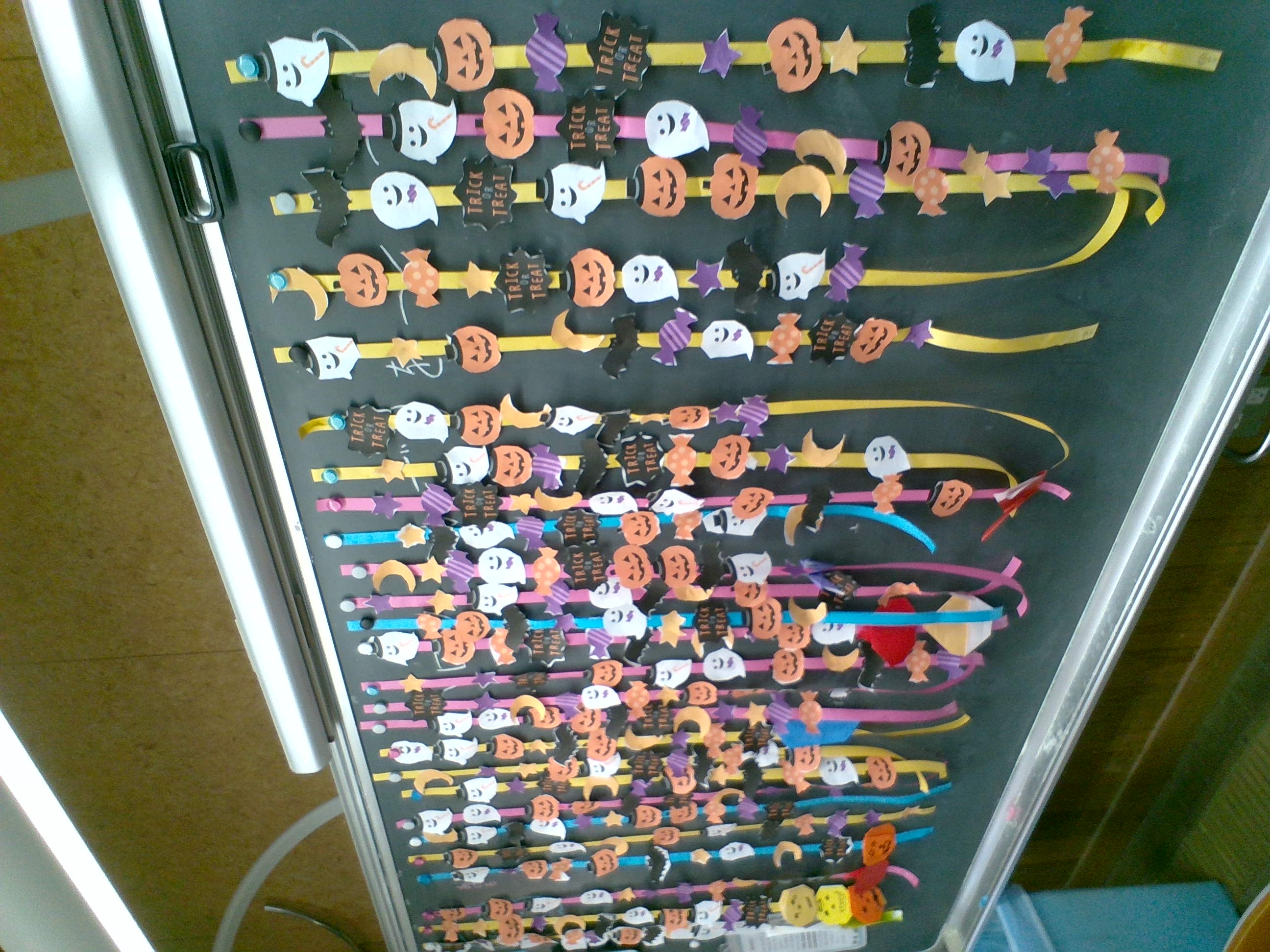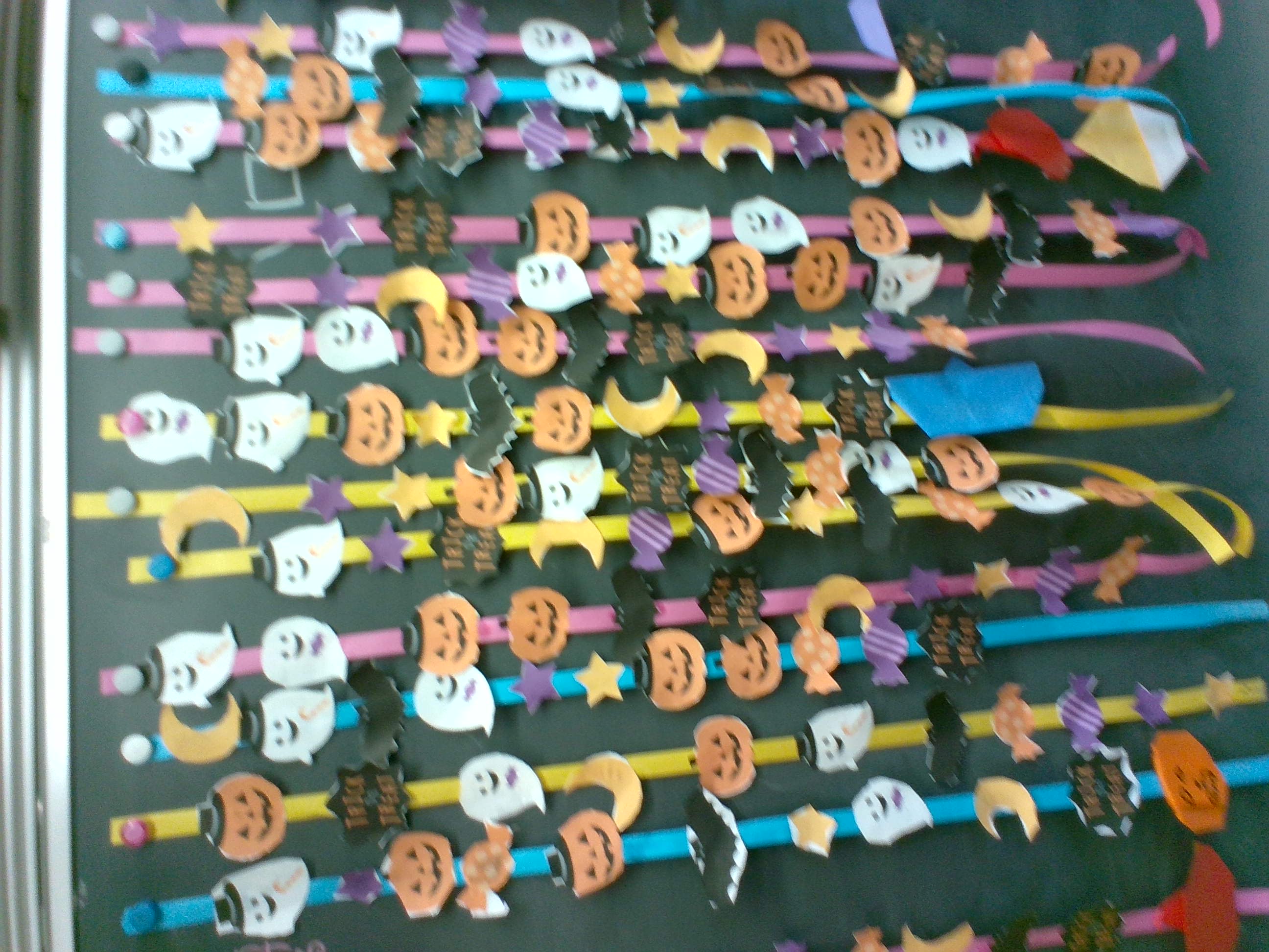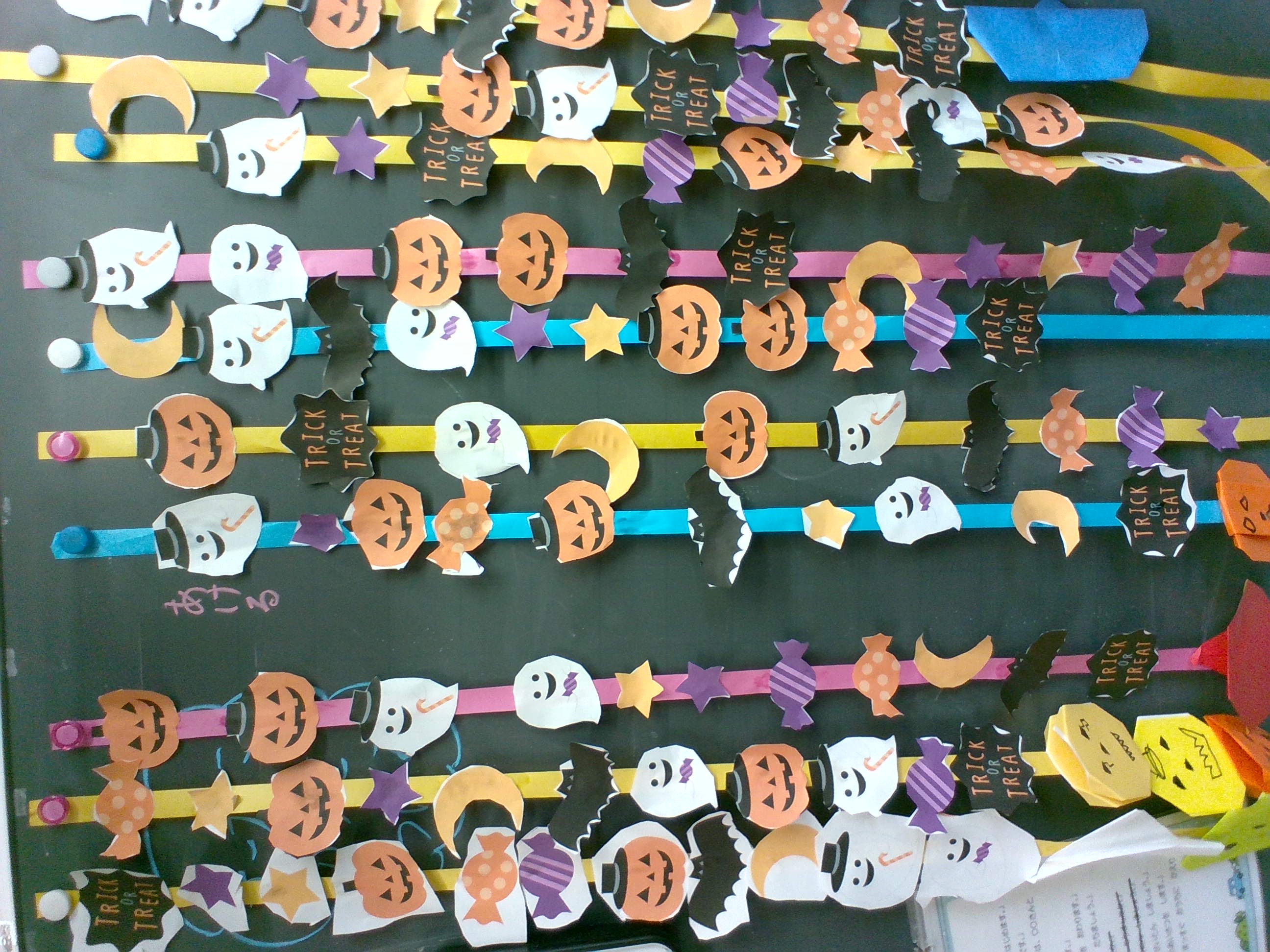 これは一年生の作品です。 10月のハロウィンで出てくるかぼちゃやおばけがつくられていました。 どれもいい作品ですみなさん「トリックorトリート」。