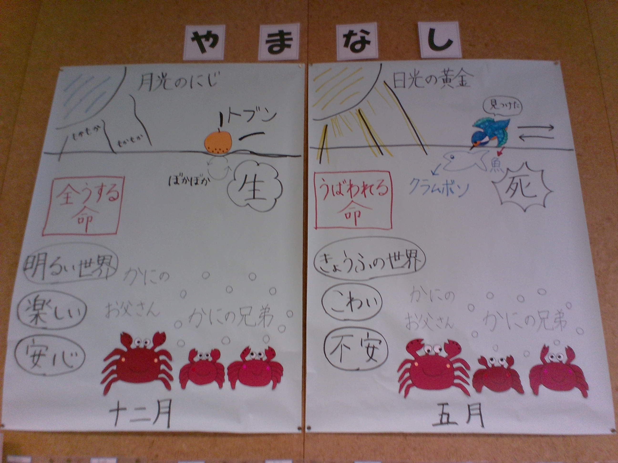 国語では、やまなし、算数では、図形の面積を学習しています。 やまのなしを追いかける姿をカニ目線でえがいた作品です。 円の公式を作って工夫して計算しました。 中学校に向けて勉強を頑張っていきたいです。