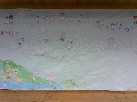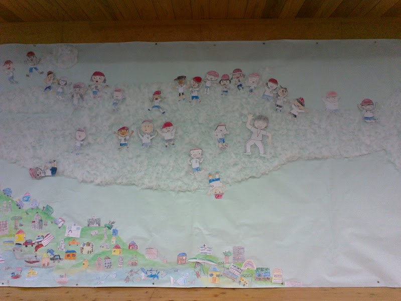 これは1年生が作った、くじらぐもの作品です。 国語の時間に習ったお話で、体育の時間にくじらぐもがあらわれるお話です。 雲を綿で表現しました。1年生が自分たちの絵を描き、くじらぐものお話の中に入り込んだような作品が完成しました。